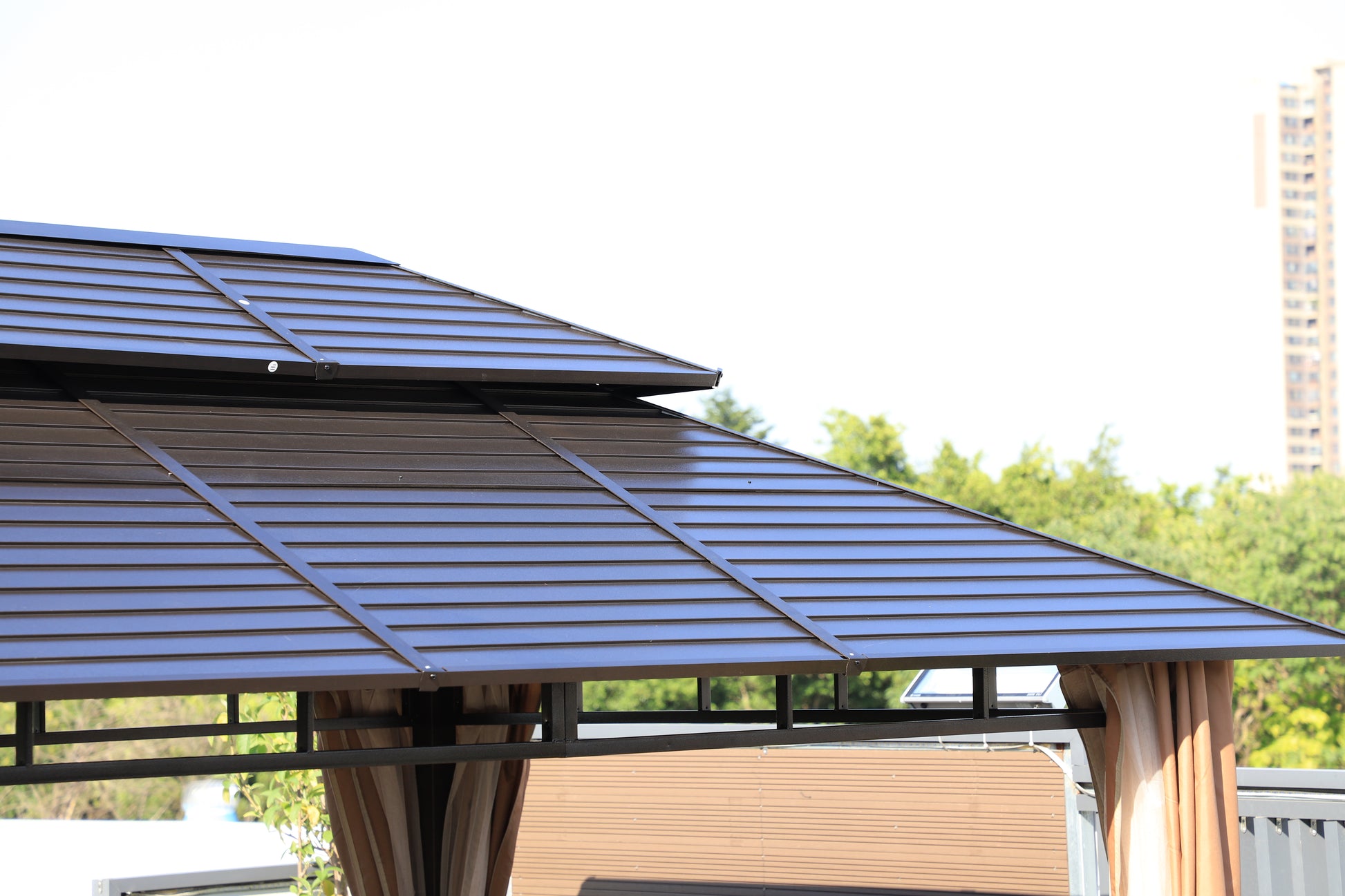 ● Weatherproof Galvanized Steel Roof: The hardtop gazebo adopts a heavy-duty galvanized steel roof, which is rustproof, sun-protection, and weatherproof. Moreover, it can reduce 99% harmful sunlight on sunny days, withstand heavy rain and wind (up to 46 MPH) on rainy days, and withstand heavy snow loads of 1880 lbs on snowy days.