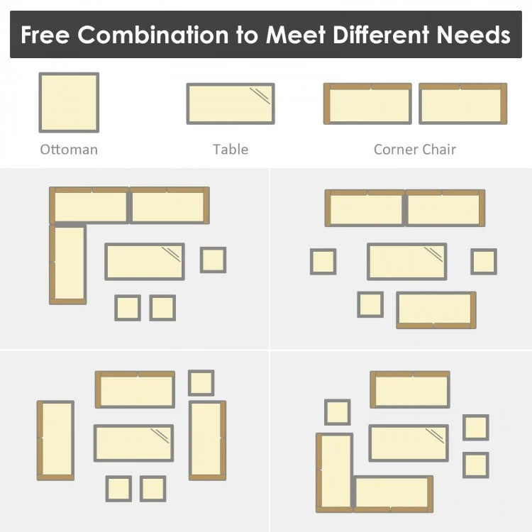 ● Free Combination and Modern Design: Including 3 corner chairs, 3 ottomans and 1 table, this rattan sofa set provides enough space for gatherings of family or friends and can be easily changed to different layouts based on your needs. More, this simple yet stylish sofa set can match well with any outdoor space including garden, patio, poolside, etc.