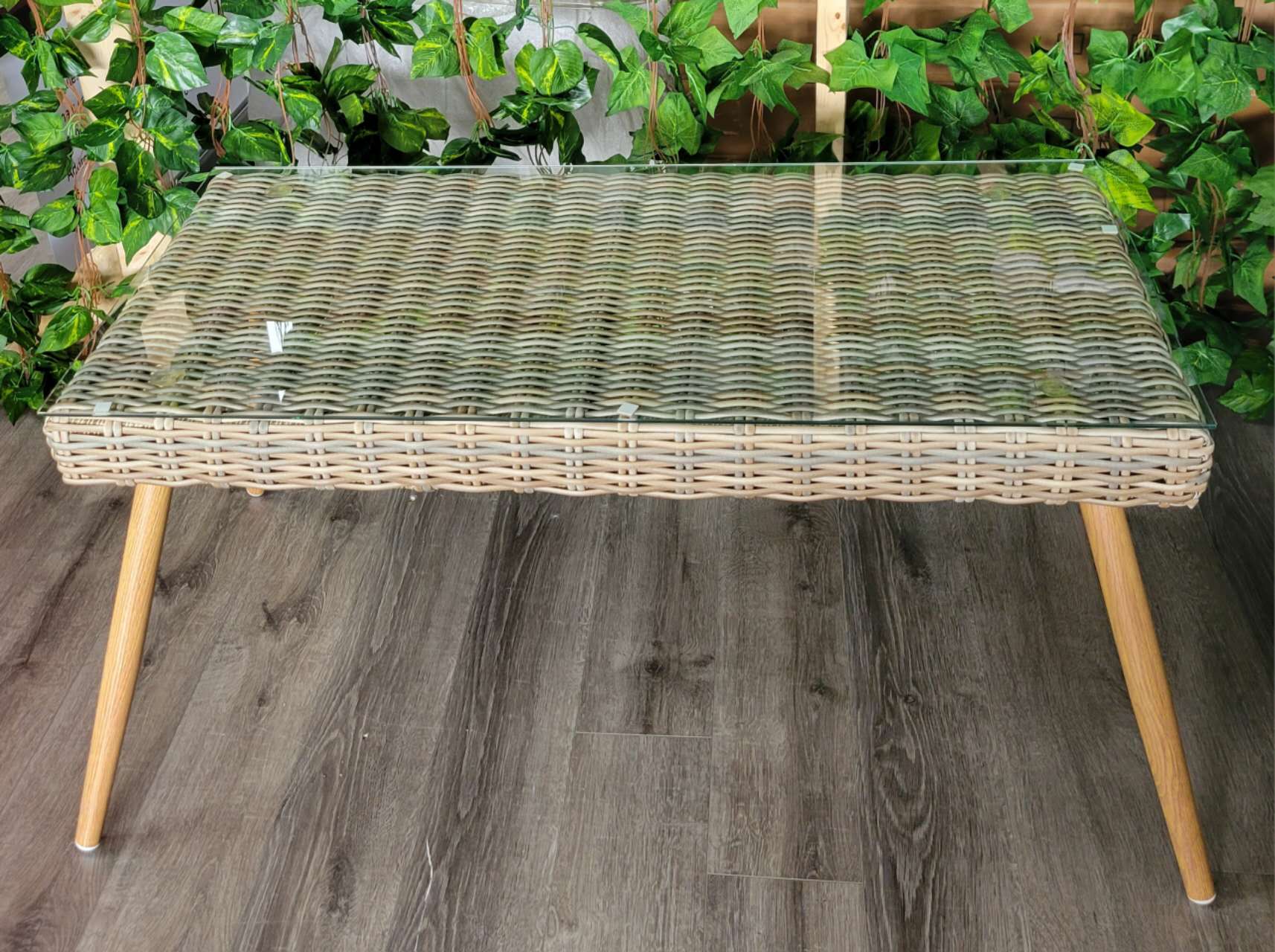 This 4-piece outdoor seating group creates a cozy and intimate gathering spot on your porch or patio. It includes a coffee table, loveseat, and two chairs. Each piece is made with a metal frame wrapped in breezy gray resin wicker, and they rest on splayed wooden legs for plenty of coastal farmhouse charm. The seats strike a square silhouette for a streamlined look, while same gray polyester cushions add lots of padded support while you hang out under the sun. Plus, the coffee table in this set features a glass surface that's easy to clean and ideal for placing down drinks and bowls of snacks. the sofa and chairs have sturdy steel tapered legs painted to look like real wood, making the 4pc sofa set durable and unique.