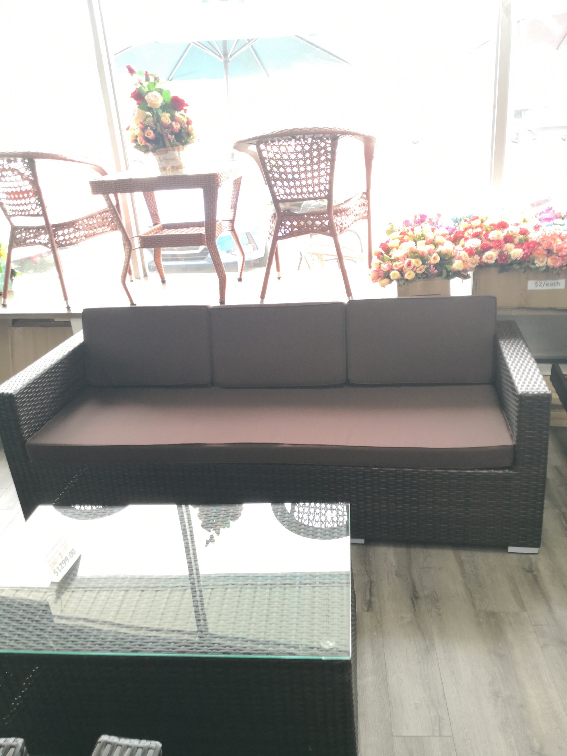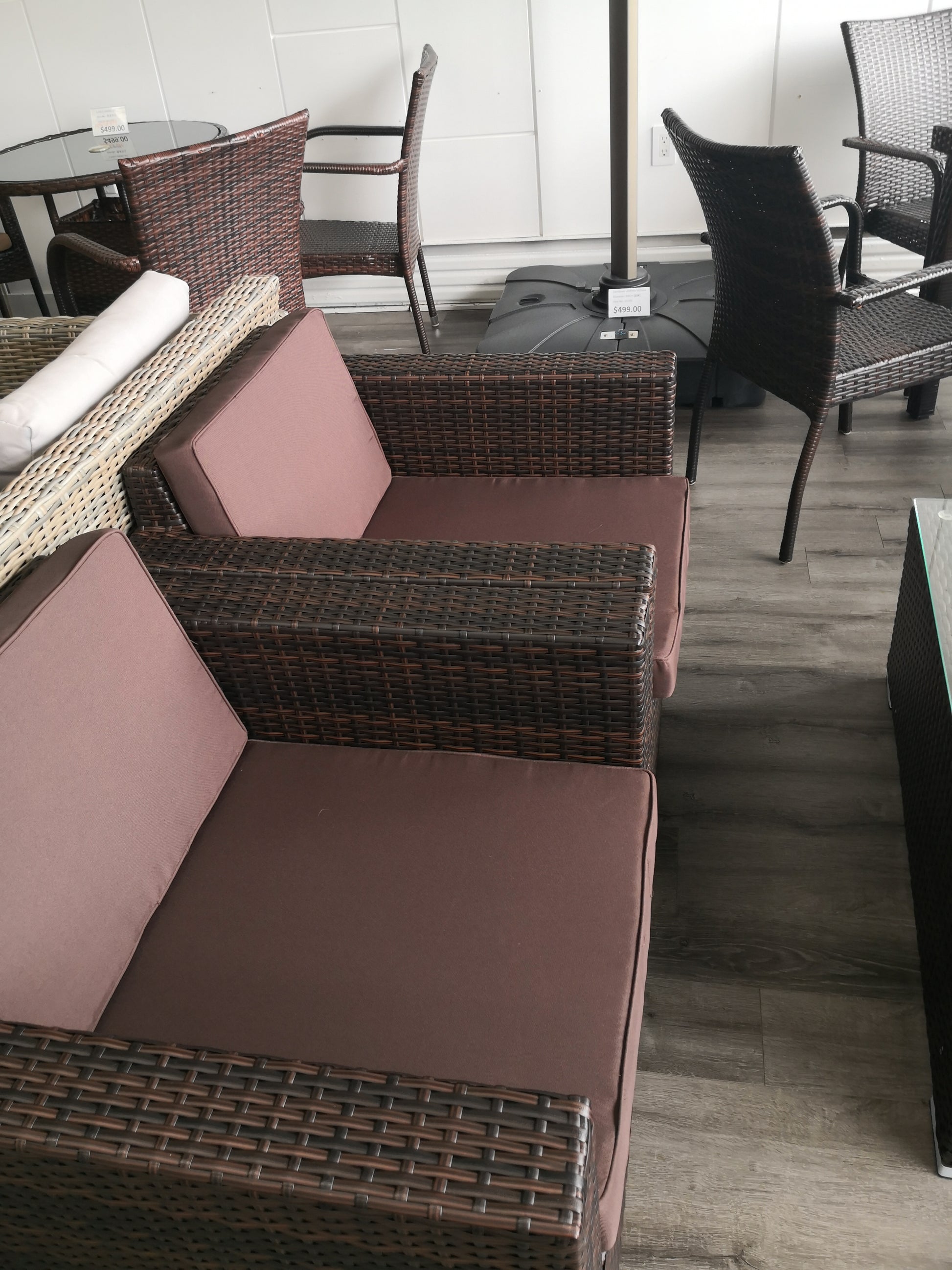 Destress in luxury with this collection. This outdoor seating set features a custom hand-woven, two-tone walnut-coloured wicker, Each piece is made with a metal frame wrapped in breezy two-tone walnut-coloured resin wicker which is crafted using a high-density resin material to ensure your seating set is built to withstand the elements.
